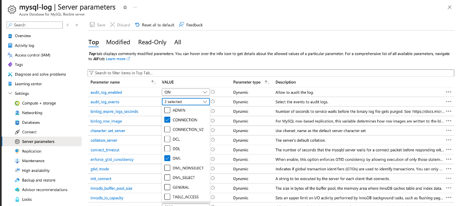 - We can also include DML event to the audit_log_events field under server parameters. This will give us logs for DML operations like INSERT, DELETE etc on the tables.