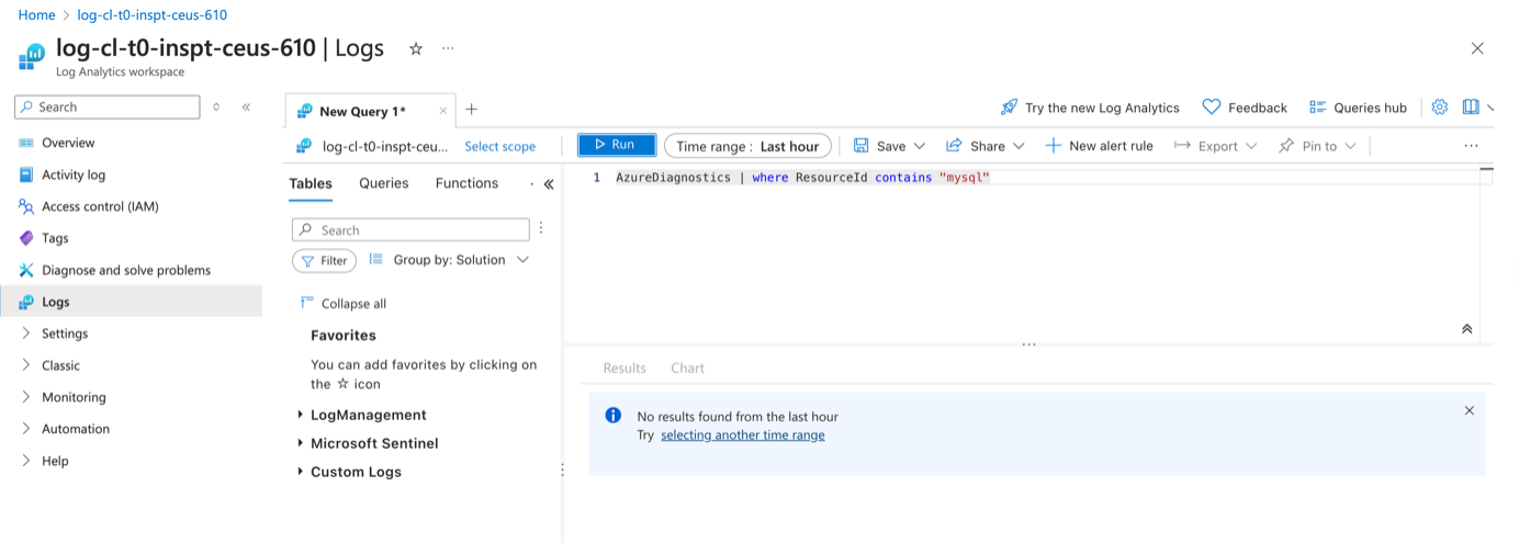 Although all the log categories are enabled under the diagnostic settings, still while querying the LAW, we could not find any logs related to MySQL Audit Logs Category even after doing some operations against the database. For this, some addtional configuration needs to be done.