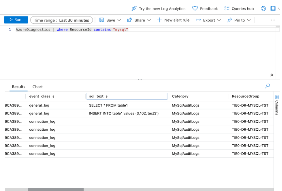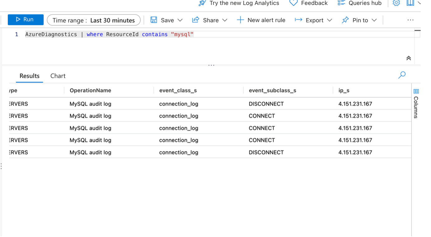 - Once the audit log is enabled from the server parameter, we can see the logs for MySQL Audit with the connection_log event class inside the AzureDiagnostics table of LAW.