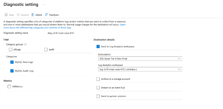 Diagnostic settings deployed on the database level has all the categories of logs enabled as shown below: