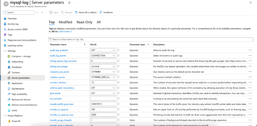 - We have Server parameters under Settings tab where we can change the default settings for the MySQL server.